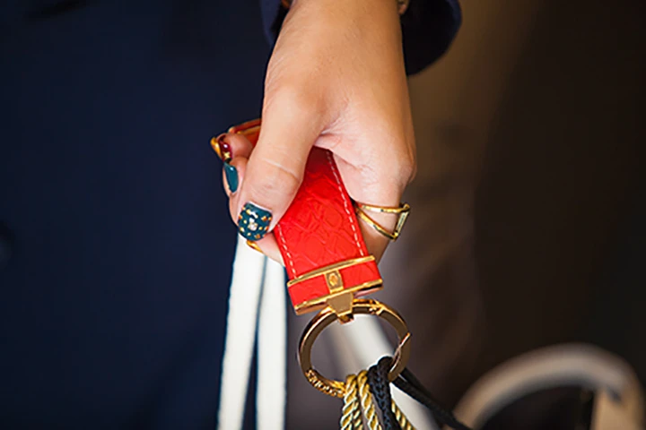 愛情鎖扣利了用兩端鑲有施華洛世奇水鑽的18K金金屬環及牛革真皮,具有堅固細緻的特質可以將您的包包掛在籃子邊緣、椅背等等,讓您在外出時可以更輕鬆、優雅。